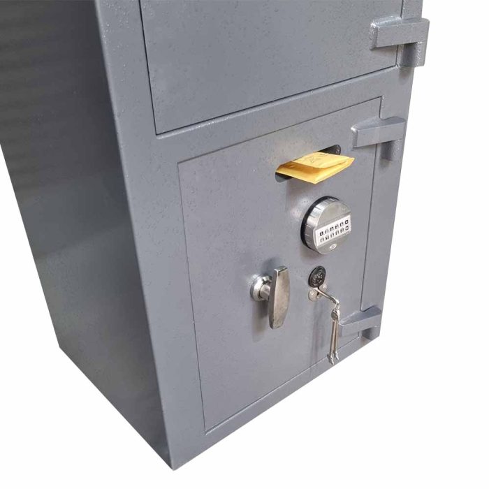 Its dual-compartment design allows separation between deposit and storage operations. It includes a standard internal slot between compartments and can be configured with deposit slots on the doors, making it an efficient solution for businesses handling large volumes of cash.